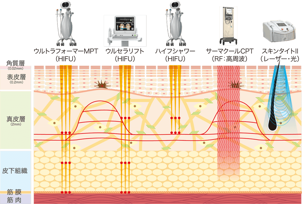 HIFU(ハイフ)は、高密度の超音波の熱エネルギーを皮膚深層から筋膜にかけて照射します。